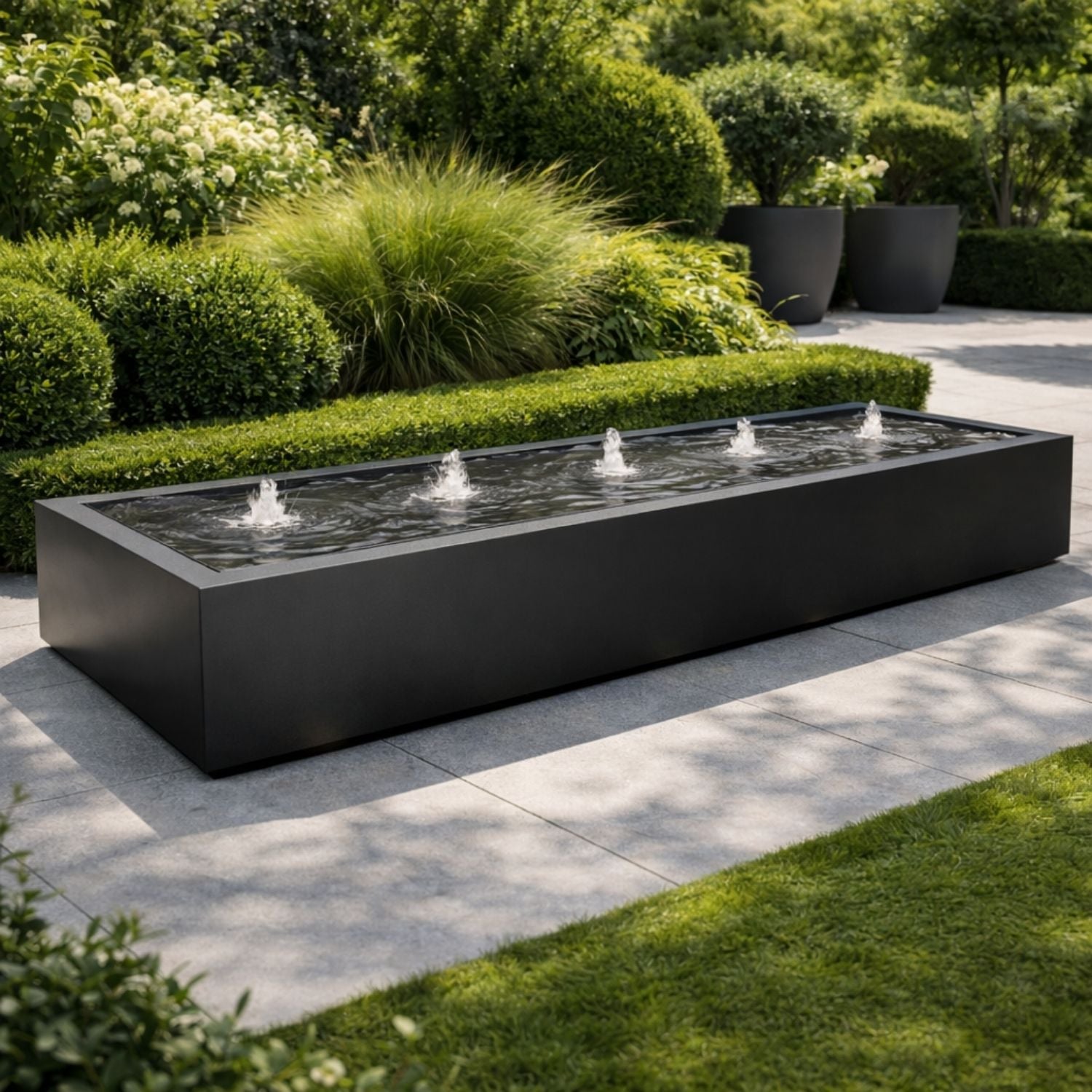 Our water tables are a unique decoration for gardens. The sleek, angular shapes add extra atmosphere and dynamics to any outdoor space. The Geroba Taula aluminum water table rectangular 400x100x40cm 103kg fits perfectly among the greenery and thanks to the standard pump and fountains with LED lighting, you can also optimally enjoy the soothing effect of running water in the dark.