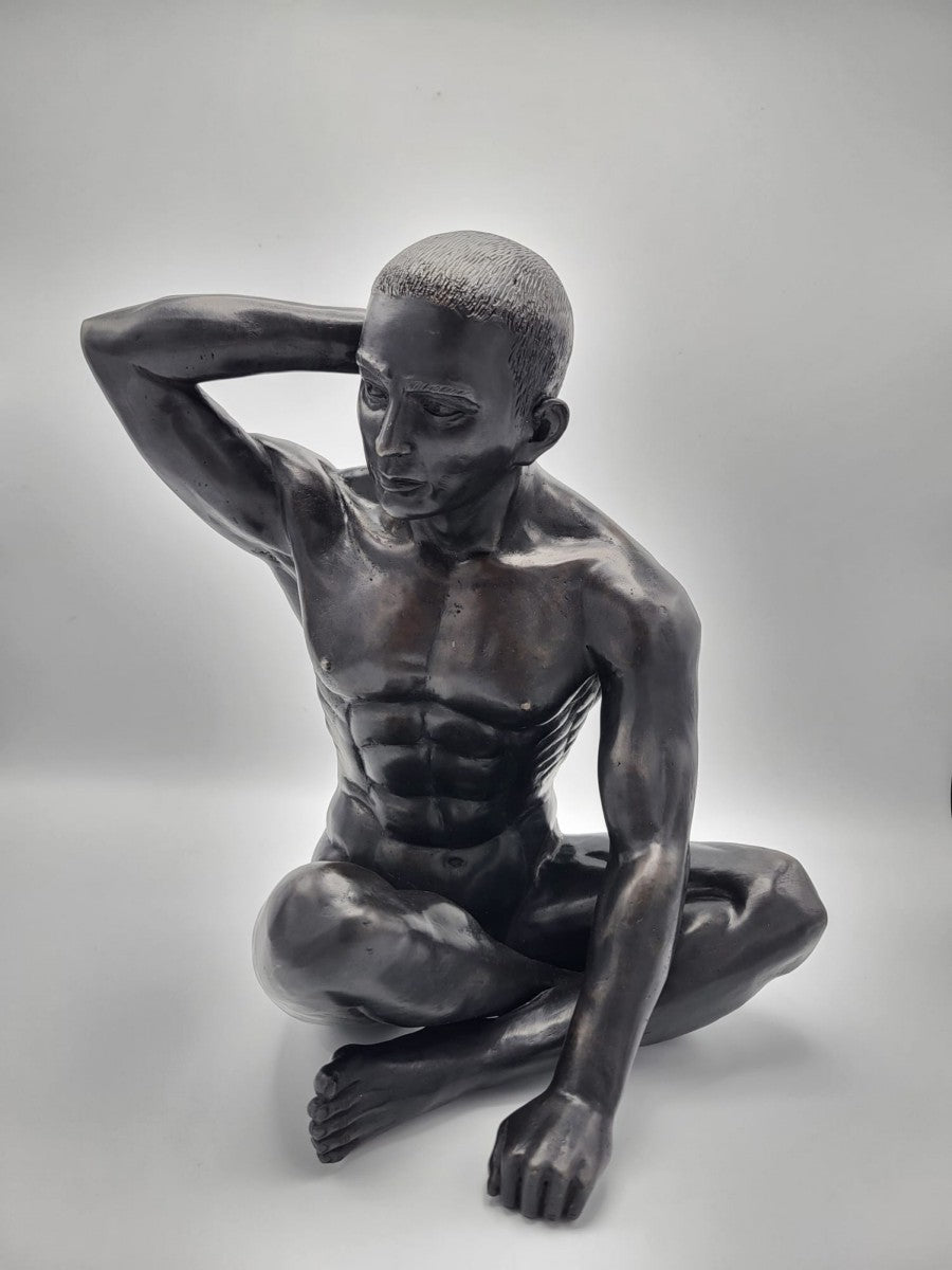 Bronzen beeld Zittende man arm omhoog 35x25x35cm